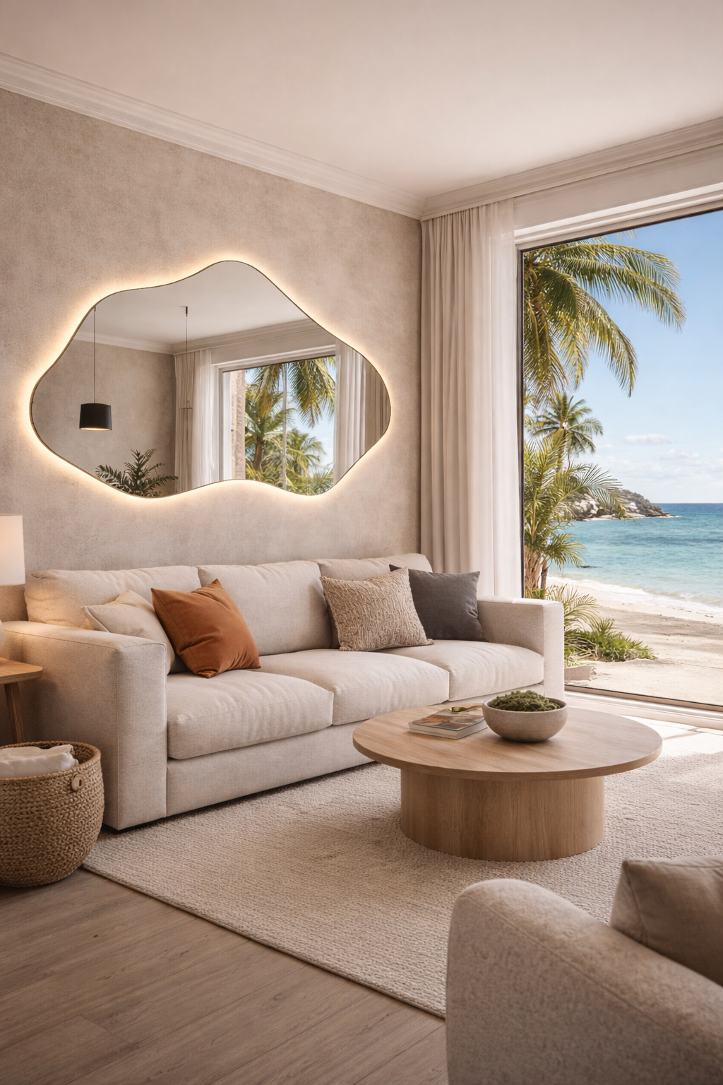 Why Choose the Bilbao LED Bathroom Mirror? Combine style and function with this handcrafted asymmetrical mirror. The optional LED lighting transforms your daily routine into a luxurious experience, while the irregular shape adds artistic flair to your bathroom or bedroom decor.