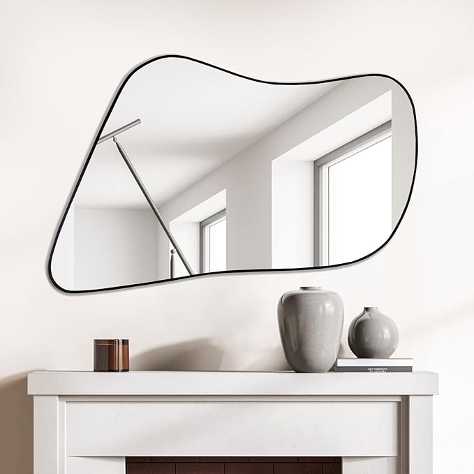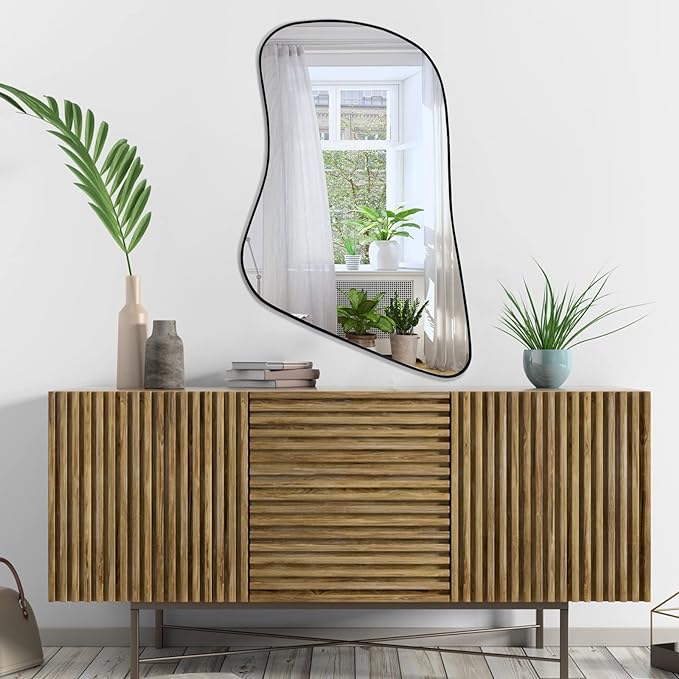 Asymmetrical and Unique Design: This mirror features an asymmetrical design with a slightly curved edge, giving it a modern and stylish look. The irregular shape and unique textures add depth and character to any room.
