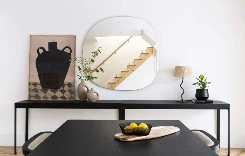 Asymmetrical and Unique Design: This mirror features an asymmetrical design with a slightly curved edge, giving it a modern and stylish look. The irregular shape and unique textures add depth and character to any room.